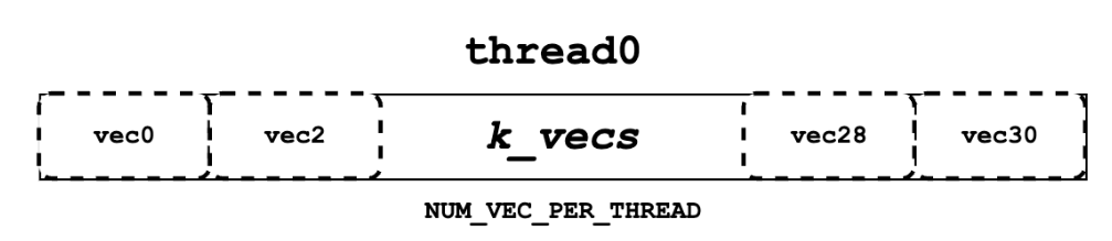 - 加载方式:采用高效的内存合并 Memory Coalescing模式。如图所示,thread0 加载 vec0, vec2 等偶数位的数据块,thread1 加载 vec1, vec3 等奇数位的数据块。由于 vec0 和 vec1 在物理内存中是相邻的,相邻线程访问相邻内存,触发合并读取,极大提升了加载效率。