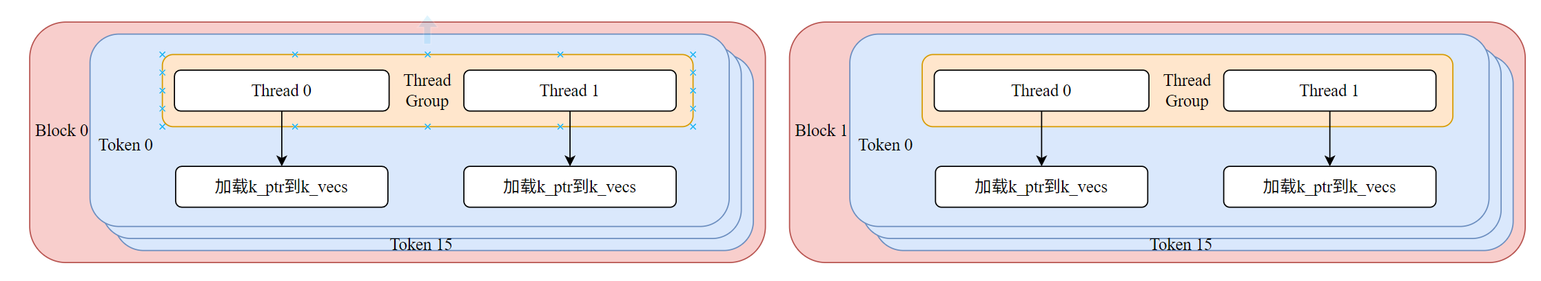 - 在 QK 部分,一个 thread_group 的职责是与组内其他线程协作加载一小部分 Key 向量以及从 global memory 中协作取出 q_ptr 指向的 query 向量,并计算它与 Query 向量相应部分的点积。