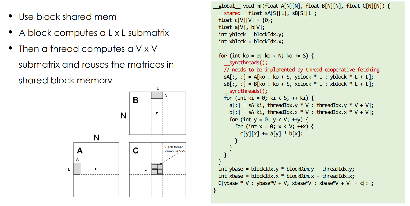 通过线程组协作加载(每个线程加载自己的一小段,线程间地址连续)可以实现 coalesced global loads(合并内存事务),并把 tile 放到 shared memory 以实现复用。