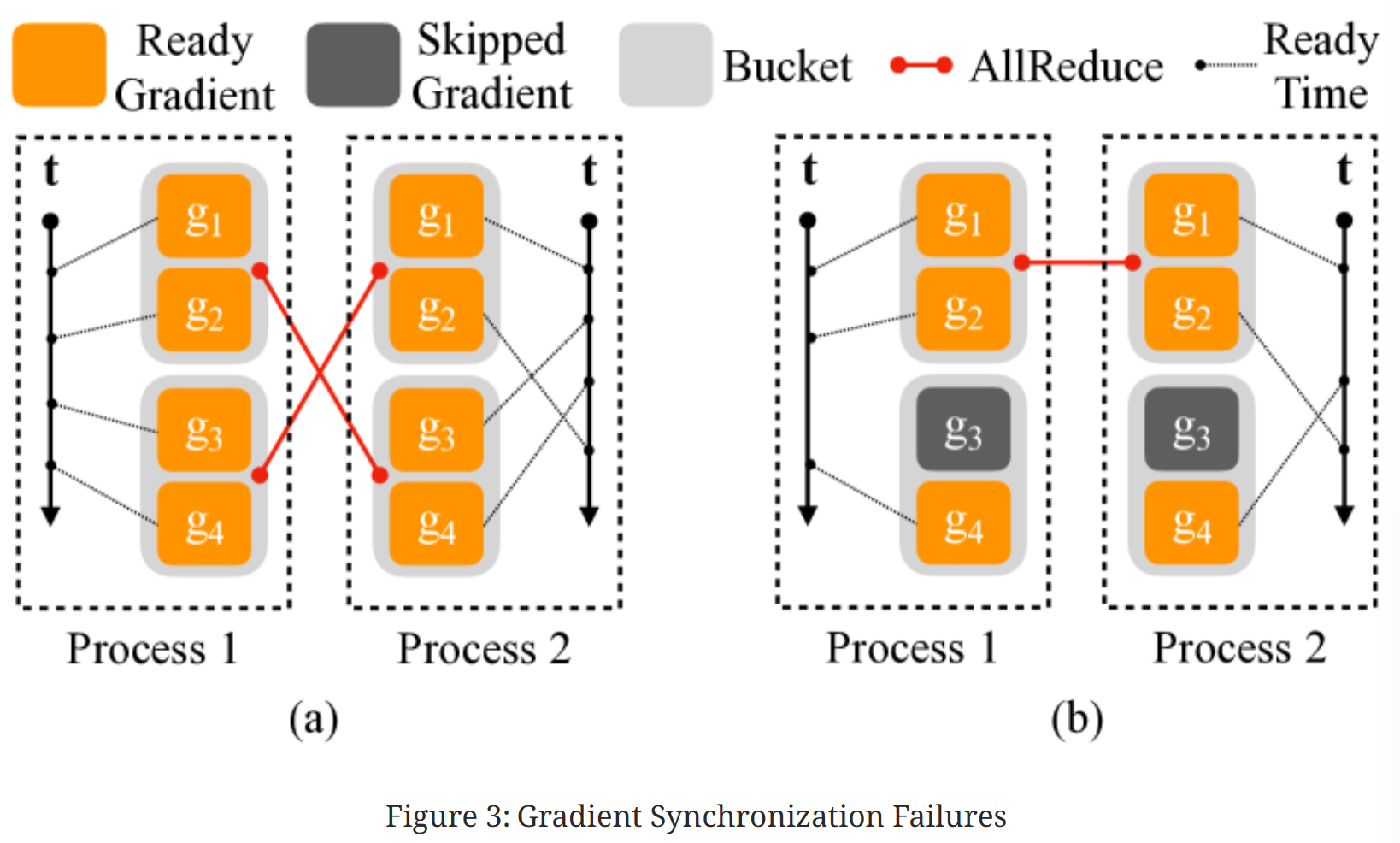 (a)显示了一个例子,其中两个垂直轴代表时间,虚线表示梯度何时准备好。在进程 1 中,四个梯度按顺序计算,但在进程 2 中,梯度\(g_2\)是在\(g_3\)和\(g_4\)之后计算的。在这种情况下,如果所有进程在准备好后立即进行 AllReduce,AllReduce 内容将不匹配(\(g_2\)还没有计算完成,结果不正确)