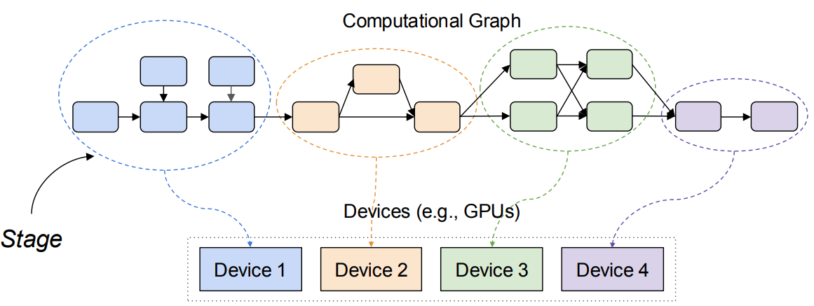 朴素的想法是把模型切分多个 stage,每个 device 负责一个 stage 的计算,类似 CPU 的 pipeline,问题变成了如何让 pipeline 的 bubbles 尽可能少