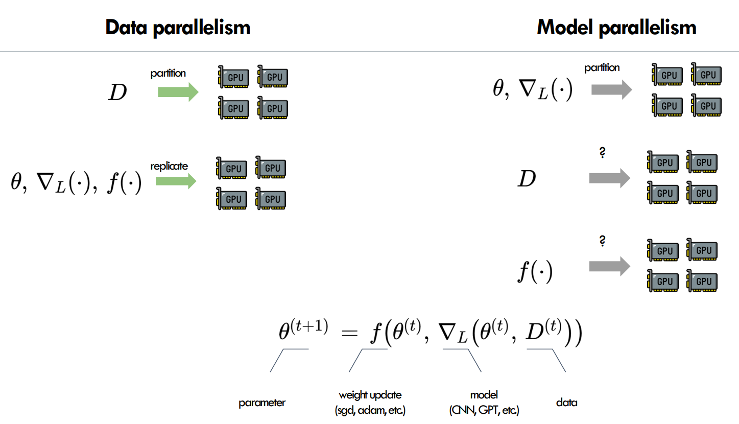 - Model Parallelism: 将模型划分到多个 GPU 上,每个 GPU 处理模型的一部分