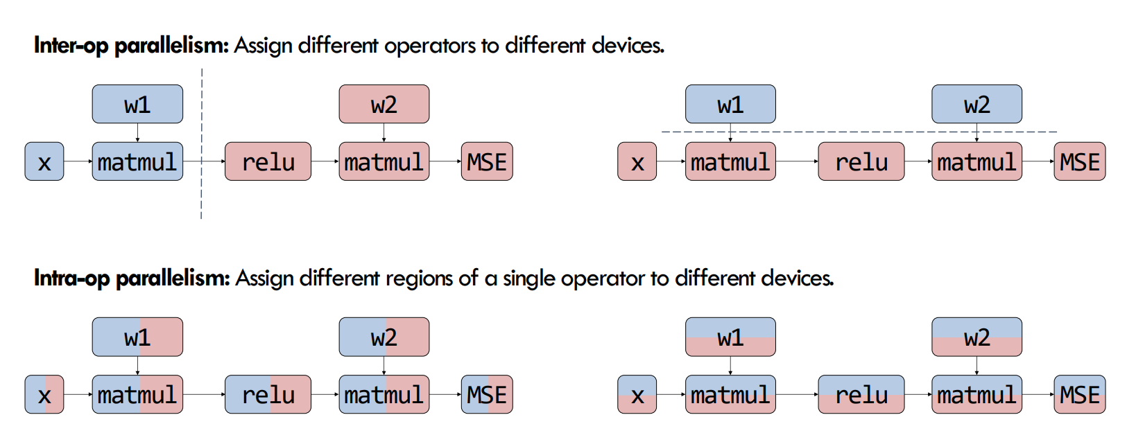 Trade-off: Inter-op 通信更少但是 Device 空闲时间更长;而 Intra-op 通信更多但是 Device 利用率更高