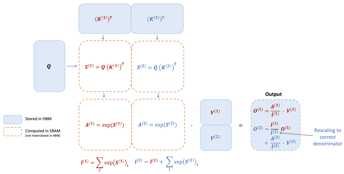 当键向量 K 被划分为两个块(blocks),并且值向量 V 也被划分为两个块时,我们可以分别对每个块计算注意力(attention),然后在最后对输出进行重新缩放(rescaling),这样就能得到与完整计算相同的正确结果。