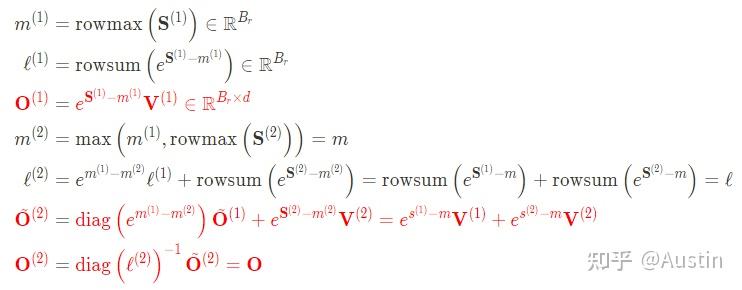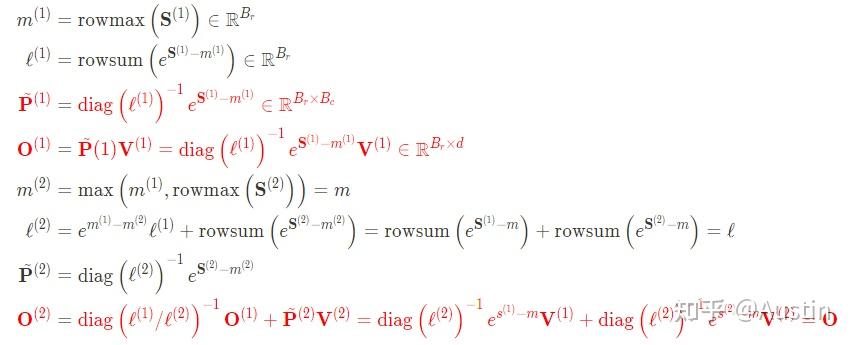 \(\ell^{(i+1)} = e^{m^{(i)}-m^{(i+1)}} \ell^{(i)} + \text{rowsum}( e^{S^{(i+1)}-m^{(i+1)}} )\),例如计算 \(\mathbf{O}^{(1)}\) 时去除了