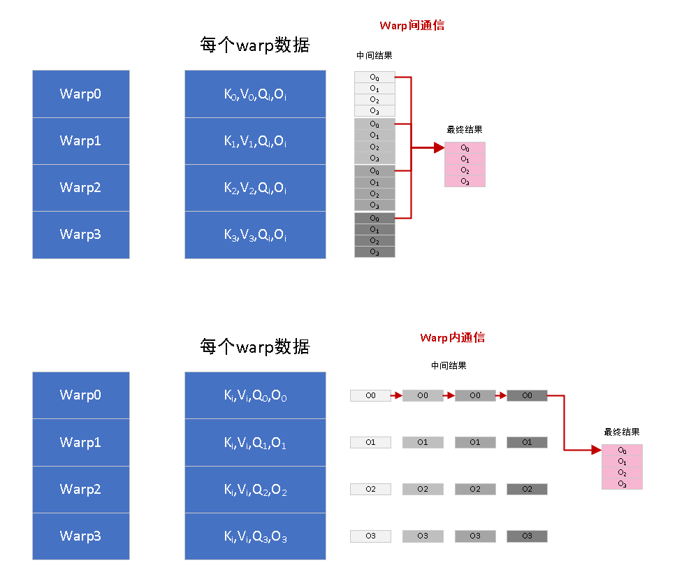 - v1 计算该块的 \(O_i\) 时,每个 warp 算出了矩阵乘的部分结果(\(O_i\)),需要先写入共享内存。然后再同步,并重新读取,reduce 成一个。会有额外的共享内存读写开销,和不同 warp 同步的开销。