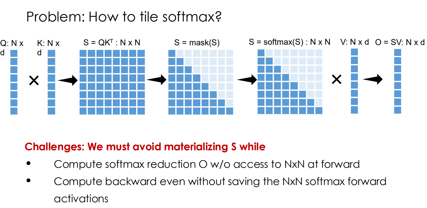 我们希望尽可能将 attention 分块,部分加载到 shared memory 进行一次计算后直接写回,避免多次的读取和写入。这就带来了挑战,我们必须避免显式地(在内存中)构建出矩阵 S,同时还要做到:
