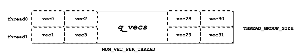 - 加载方式:采用高效的内存合并 Memory Coalescing模式。如图所示,thread0 加载 vec0, vec2 等偶数位的数据块,thread1 加载 vec1, vec3 等奇数位的数据块。由于 vec0 和 vec1 在物理内存中是相邻的,相邻线程访问相邻内存,触发合并读取,极大提升了加载效率。