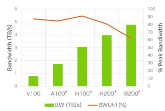 简单 kernel 难以打满带宽。真实带宽在上升但是简单 kernel 的利用率却在下降