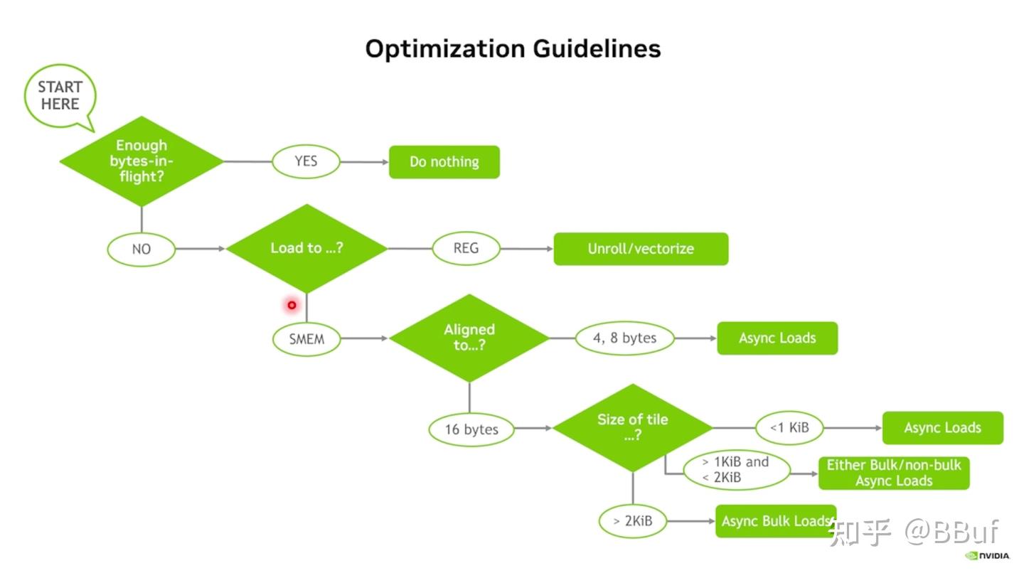 从"START HERE"开始,首先判断当前是否有足够的在途字节数(bytes-in-flight),如果足够就无需优化;如果不够,接下来判断数据加载目标是寄存器(REG)还是共享内存(SMEM)——选择寄存器就进行展开/向量化优化,选择共享内存则需要进一步考虑对齐方式和数据块大小:4/8 字节对齐时使用异步加载,16 字节对齐时根据 Tile 大小选择策略(小于 1KB 用普通异步加载,1-2KB 之间可选择批量或非批量异步加载,大于 2KB 则使用异步批量加载)
