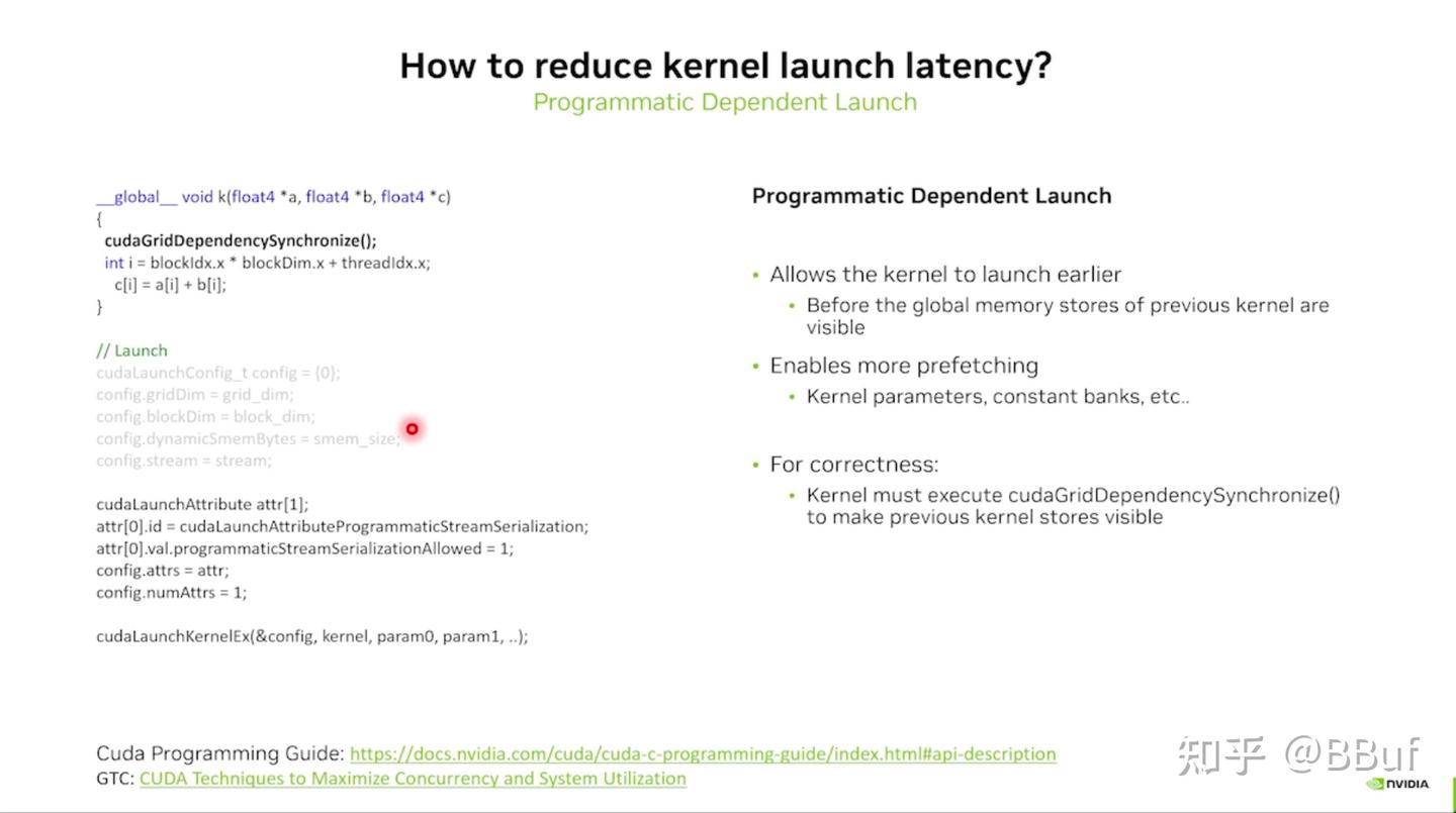 cudaGridDependencySynchronize()进行同步 - 最大化地重叠 kernel 启动和执行