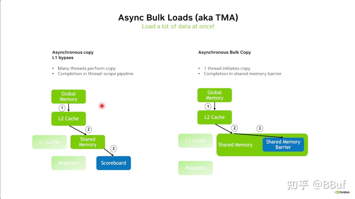 - TMA 只需要一个线程启动复制操作,通过共享内存屏障完成同步控制,实现了更高效的大块数据传输,减少了线程协调的开销。