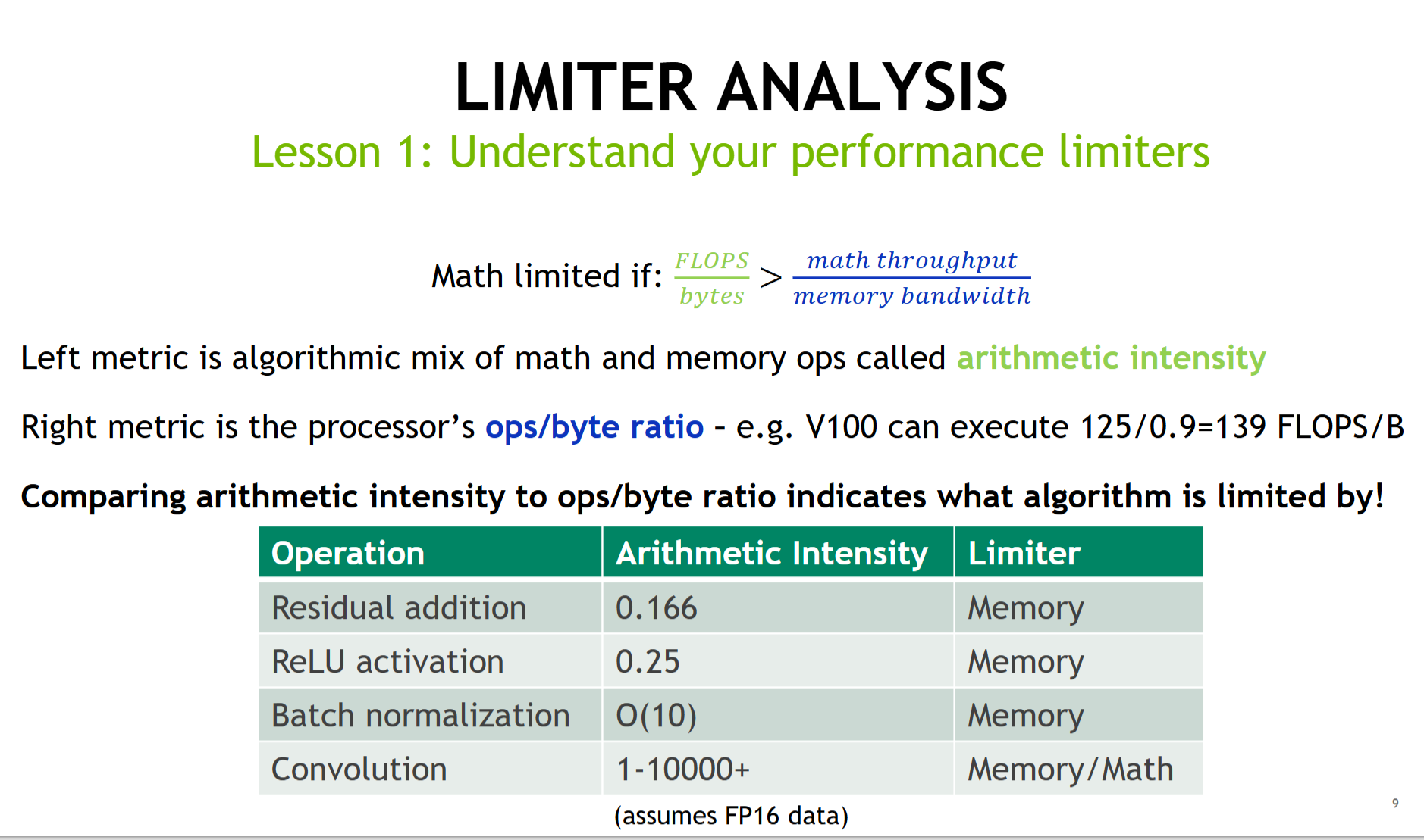 - 右侧指标是处理器的ops/byte比率。例如,V100 GPU可以执行125/0.9=139 FLOPS/B。