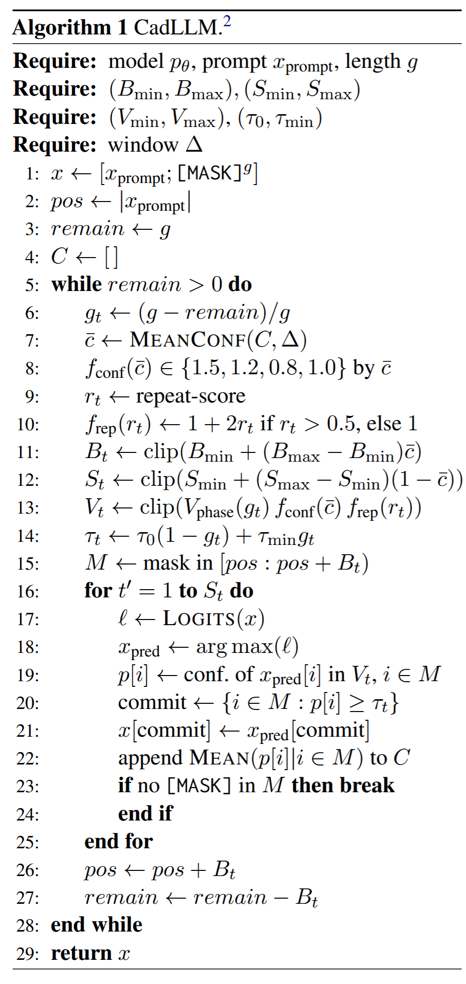 通过根据置信度信号并行解码被掩码的 Token 来加速 MDM 的生成。它将输出组织成 \(K\) 个大小为 \(B\) 的块 (blocks),并通过 MDM 机制对每个块执行最多 \(S\) 个精炼步骤 (refinement steps)。