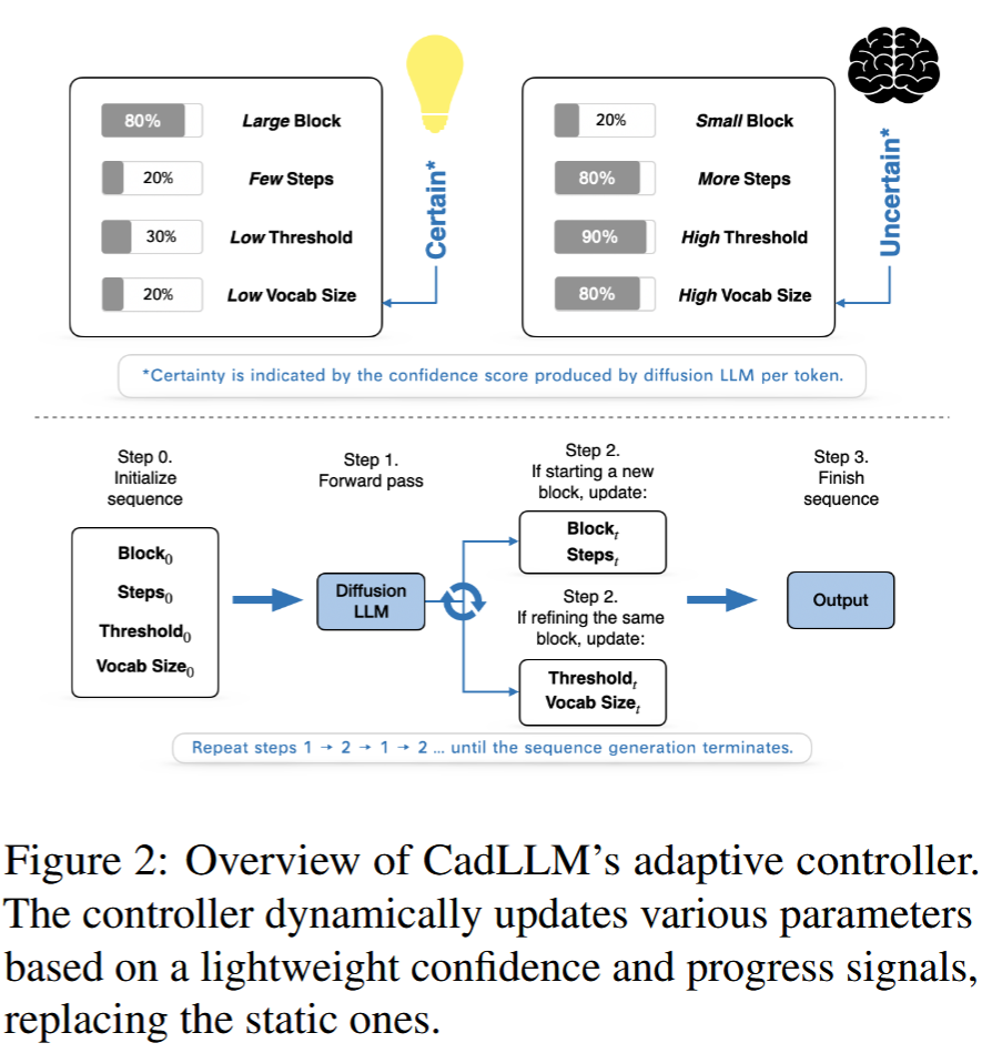 论文将 \(B_t\) 设定为与当前平均置信度 \(\bar{c}\) 成正比:高置信度的块会扩大尺寸,以摊销前向传播的计算成本;而低置信度的块会收缩,以便模型能将精炼过程集中在不确定性集中的地方。