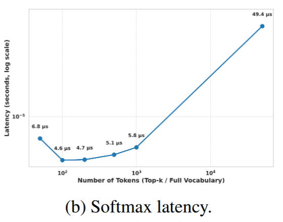 采样广度存在延迟开销,1中结果显示,延迟随着词表大小急剧增加:评估全部约 5 万个 Token 的速度几乎比使用一个小词表子集慢了一个数量级 (order of magnitude)。由于每一步 (step) 都要调用 Softmax,这可能会成为一个主要的性能瓶颈。这也证实了基于自适应词表大小的选择是必要的,以便仅在总词表的一个子集上执行 Softmax 计算