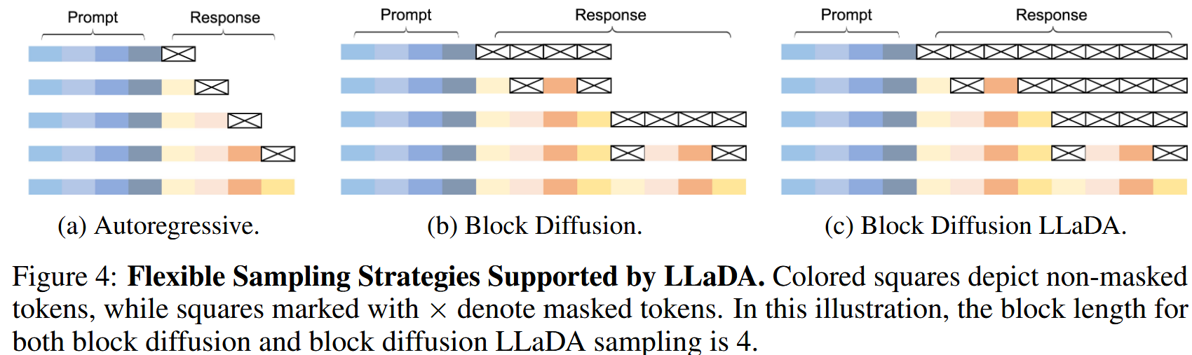 - Block Diffusion LLaDA:LLaDA 也可以采用固定长度的块扩散策略,论文中称之为“Block Diffusion LLaDA”,也称为半自回归重掩码(Semi-autoregressive Remasking)