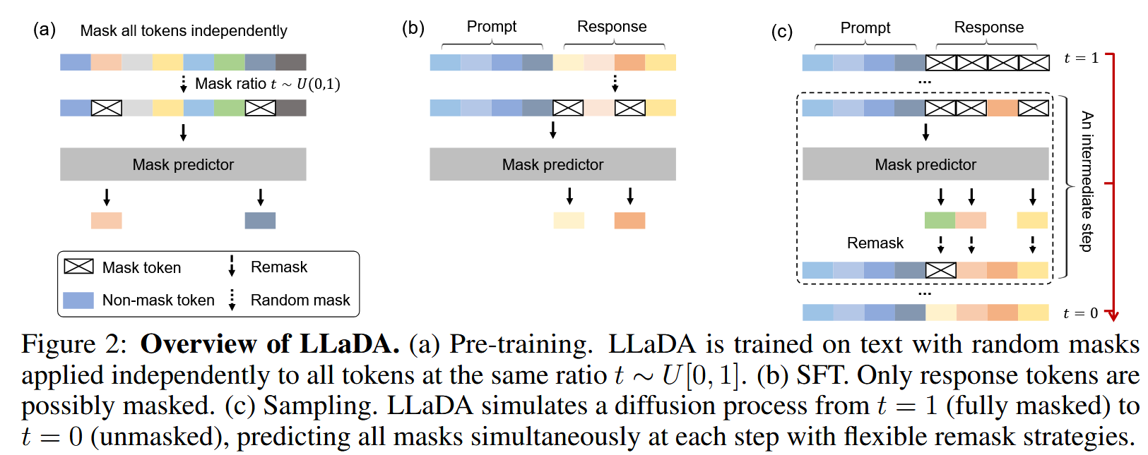 - 使用的掩码比例是随机的(\(0\) 到 \(1\) 之间),而 BERT 使用的是固定的比例。这使得 LLaDA 在数学上成为一个有原则的生成模型,能够逼近最大似然估计。