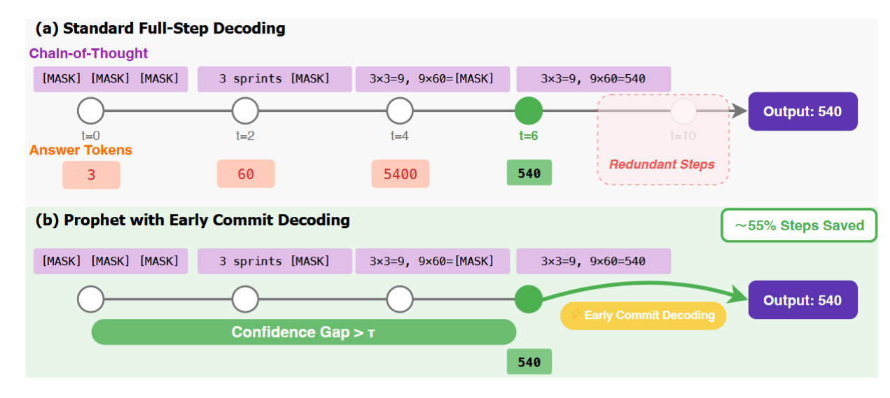 因此,Prophet 引入了一个“裁判”机制:在每一步迭代中,利用前两个预测候选之间的置信度差距(top-2 confidence gap)作为标准,动态决定是继续细化还是“All-in”(即一步解码所有剩余的 Token)。