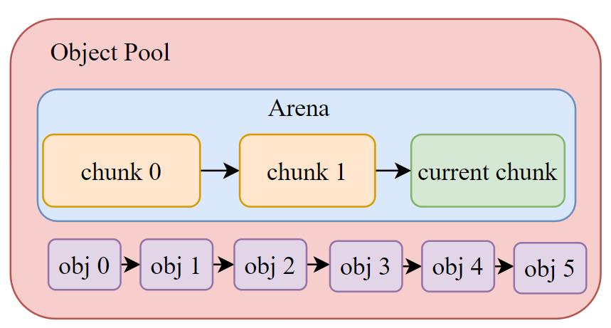 Arena 是实际上是内存池分配器,该分配器的最小单元是 chunk,系统内只会存在一个 current chunk,待分配满或者不够分配时就会申请新的 chunk,然后将前面的 chunk 和新的 chunk 通过链表连接起来,方便后续回收。