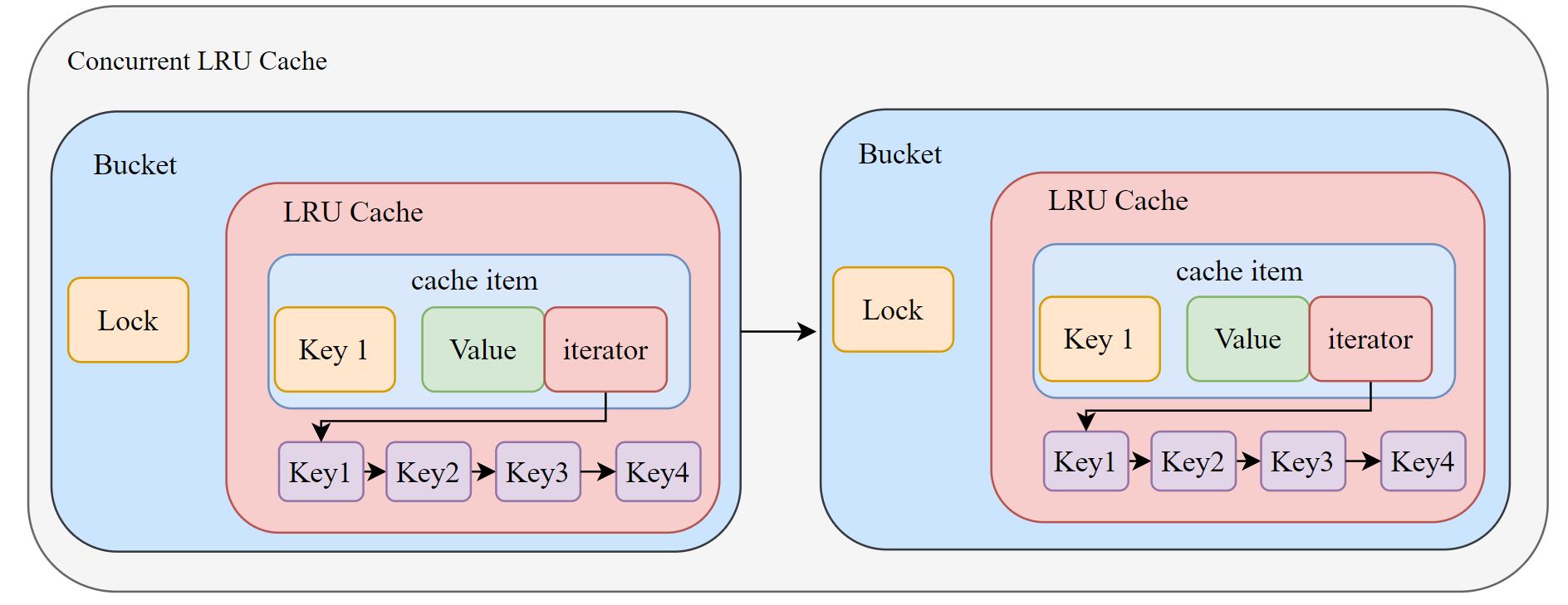 实际上并发 LRU Cache 是由多个 LRU Cache 组成的,每个 LRU Cache 和一把 lock 组成一个 Bucket,Concurrent LRU Cache 实际上就是 Bucket 数组。每个 LRU Cache 由自己的锁保护,使用 hash 来实现 bucket 并发,锁只在 bucket 这个粒度上。