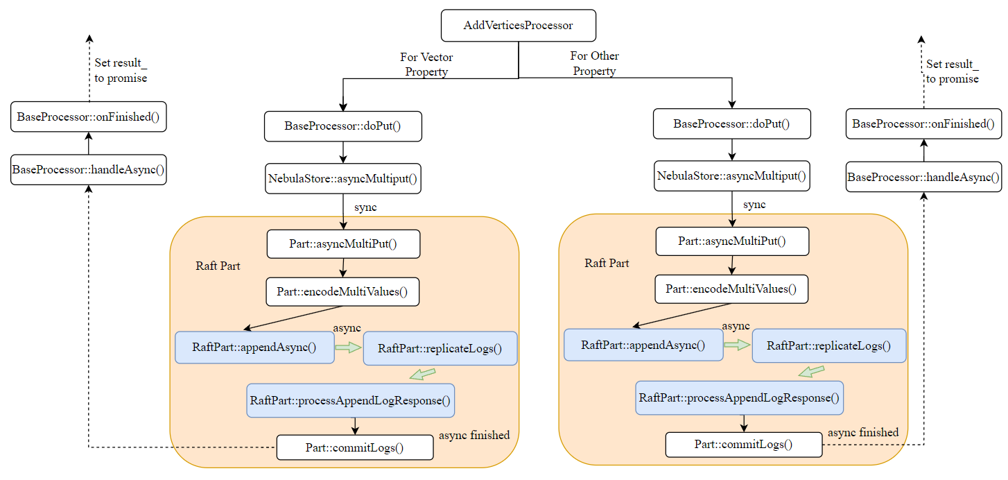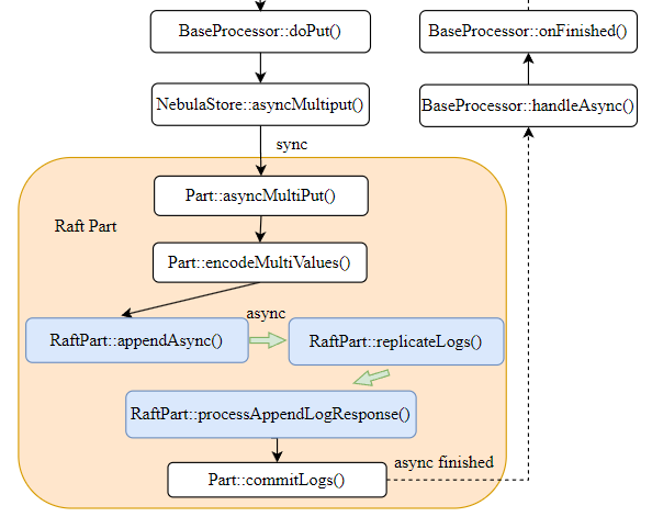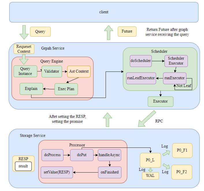 - 每个 processor 内部从 RocksDB 中获取或者存储 KV 对,实际上是通过 raft-wal 进行集群间的同步,然后用结果去设置 promise,graphd 的 future 接收到后继续向上传递结果,直到返回给 client 的结果。