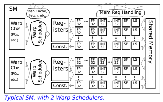 - 一个 block 中的线程会被分成若干 warp。SM 内有多个资源(寄存器文件、共享内存),这些资源在不同 block 之间分配。