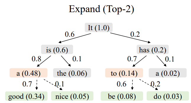 Expand 阶段:从当前层选择 全局接受概率(global acceptance probability)最高的前 k 个 token 进行扩展。