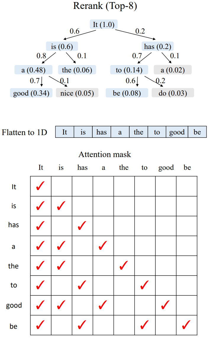 ReRank 阶段:不会直接使用扩展阶段的结果,而是对所有草稿 token 重新排序,选出全局 top-m 的节点。