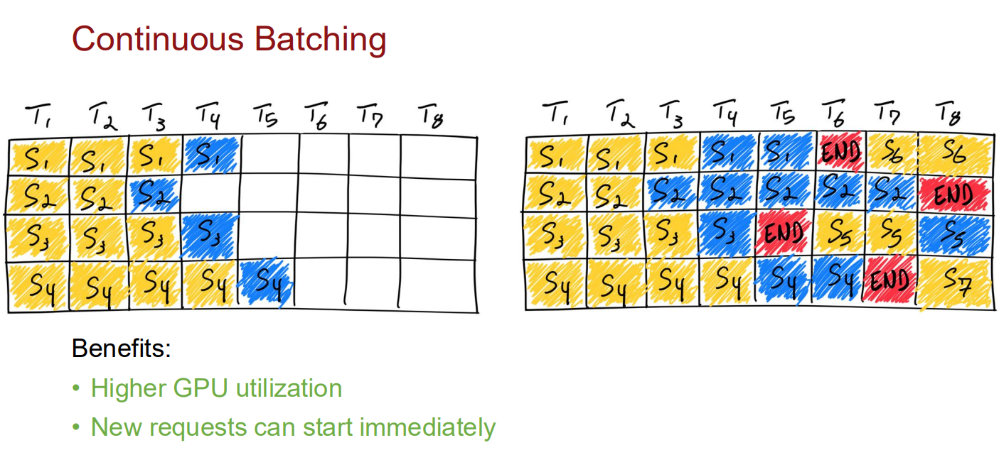 - Head-of-Line Blocking:尽管有所改进,动态批处理仍然在请求级别上运作。这意味着一旦一个批次开始处理,它仍然是一个同步的、不可分割的单元。整个批次必须等待其中最慢的请求完成,才能开始下一个批次的处理。对于输出长度极不确定的 LLM 推理任务,队头阻塞问题依然存在,只是程度有所减轻 。