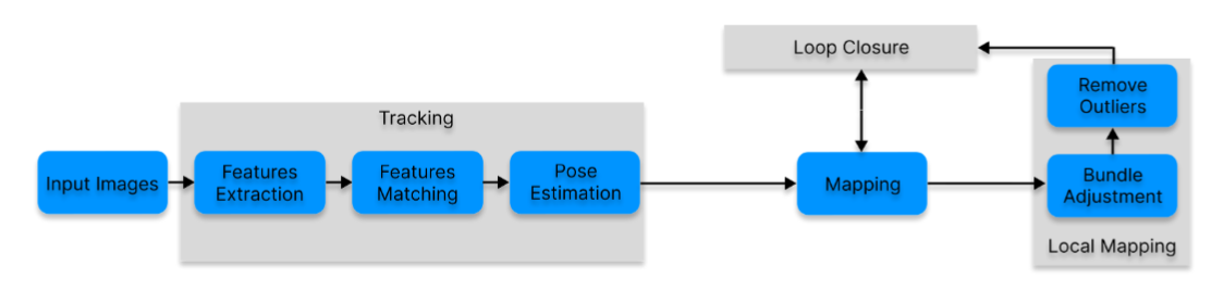 - tracking to estimate pose, mapping to reconstruct the environment, and optimization through bundle adjustment with loop closure detection