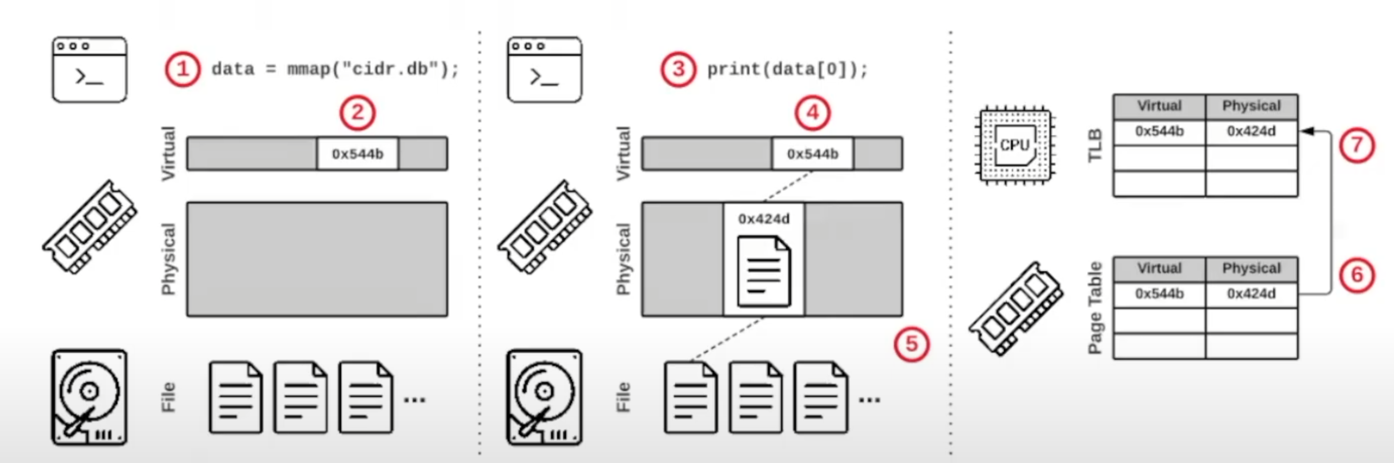 - 直到用户开始访问该文件数据,OS 发现虚拟内存没有对应的物理内存,触发 page fault,此时 OS 将文件的相应部分加载到物理内存中