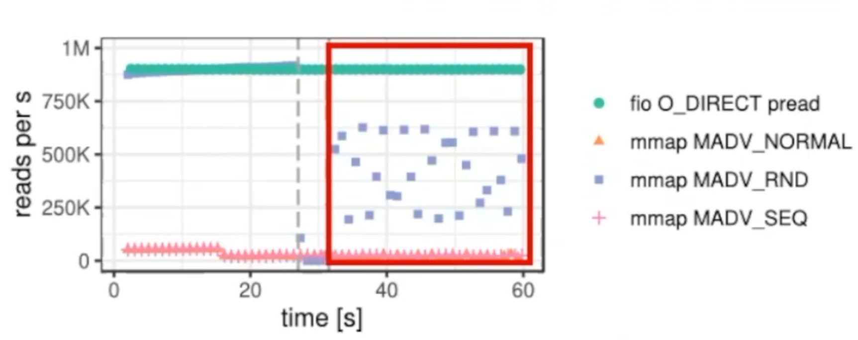 - 例如,只读取必要页面的 MADV_RANDOM 模式对于大于内存的 OLTP 工作负载是更好的选择,而 MADV_SEQUENTIAL 模式对于顺序扫描的 OLAP 工作负载是更好的选择。