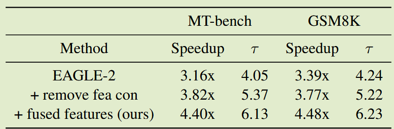 - 直接去掉 \(l_{fea}\),first token的接受率 \(0-\alpha\) 显着提高。然而,步骤 1 中草稿模型的输出表示为\(\hat a_{t+1}\),与真实值 \(f_{t+1}\) 相距甚远,导致步骤2中的输入序列明显偏离训练分布,导致第二个草稿token的接受率 \(1-\alpha\) 非常低