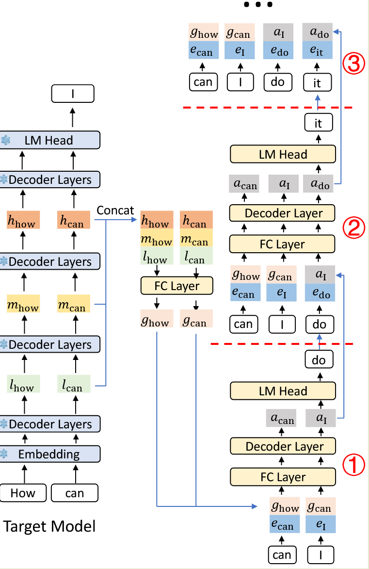 - 实质上与 EAGLE-2 的 pipeline 相同,只是 draft model 的输入变成了 target model 的多个层的特征,而不再是单纯的 second-to-top-layer 的特征。