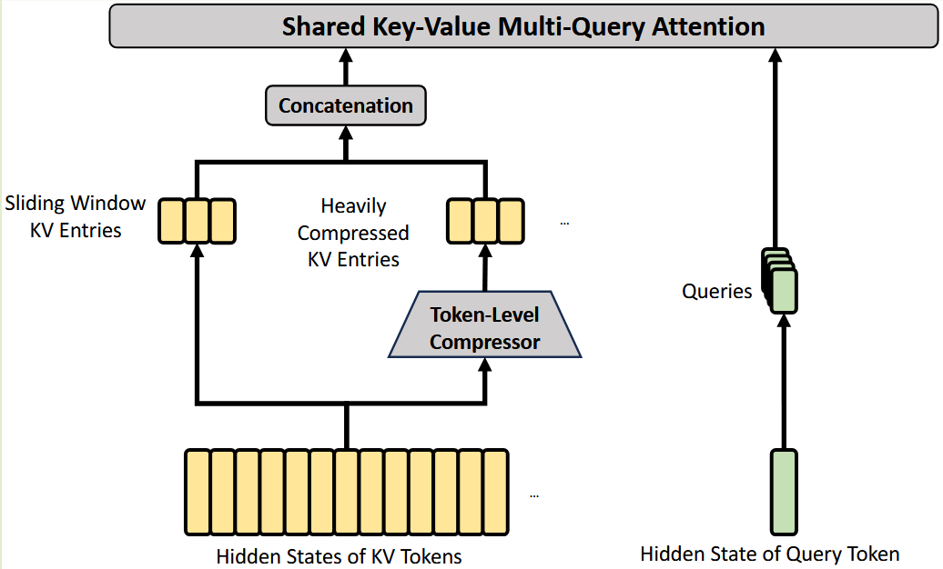 Compressed KV Entries:每 m′ 个 token 压缩成一个 compressed KV,m′ 远大于 m,压缩程度更高,适用于更长的上下文
