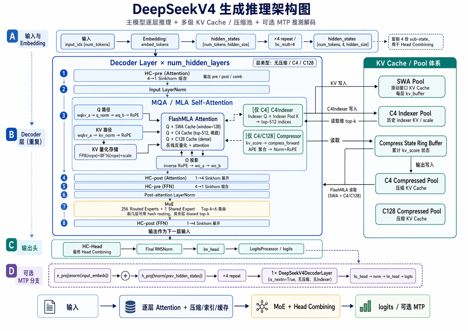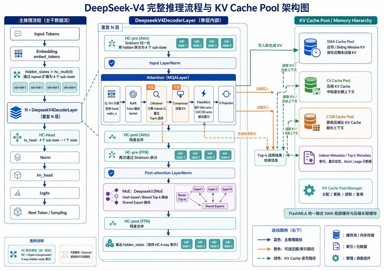 - FlashMLA:SWA cache + C4/C128 cache 注意力