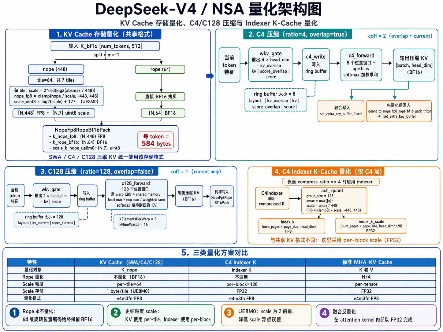 | C4 压缩 KV Cache | ratio=4, 重叠滑动窗口 | FP8 nope + BF16 rope + UE8M0 scale | NopeFp8RopeBf16Pack |