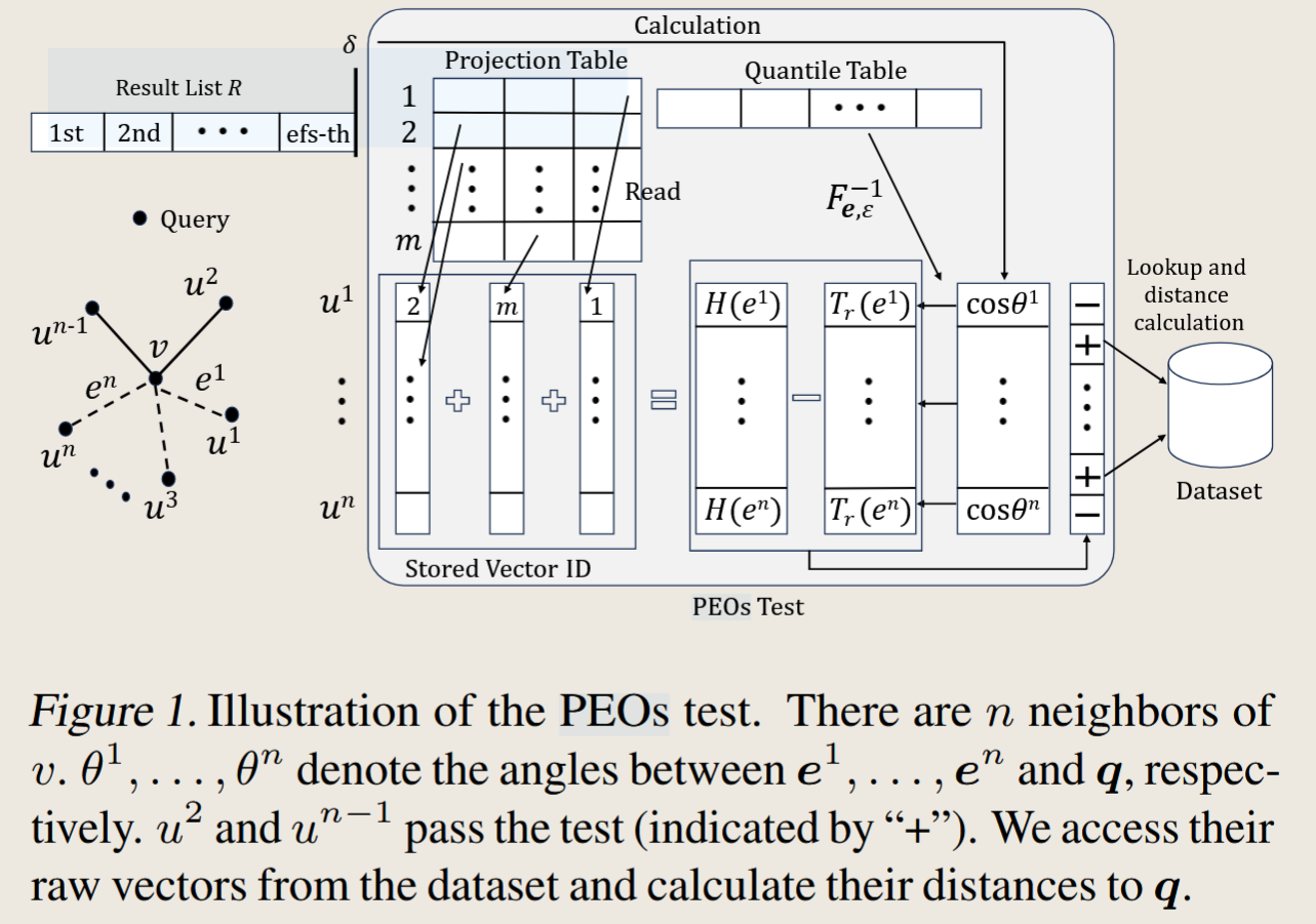 - Query Projection: Given query q, we normalize it to q and calculate the inner products with the projected vectors to obtain two values \(H_1(e)\) and \(H_2(e)\).