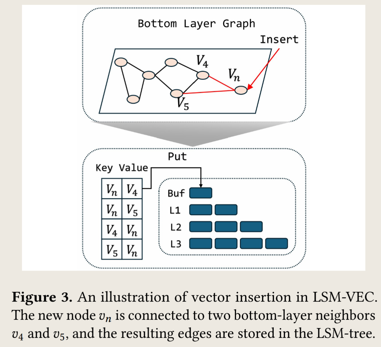 - At the bottom layer, neighbor search is conducted on the disk-resident graph stored in the LSM-tree. The vector is connected to the top-M nearest disk-resident nodes, and the resulting edges are written to the LSM-tree for durable storage.