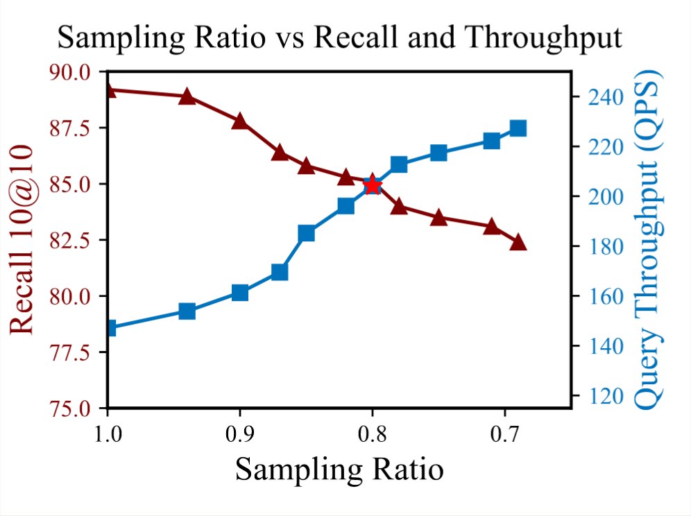As sample ratio increases, QPS improves significantly, while recall remains stable.