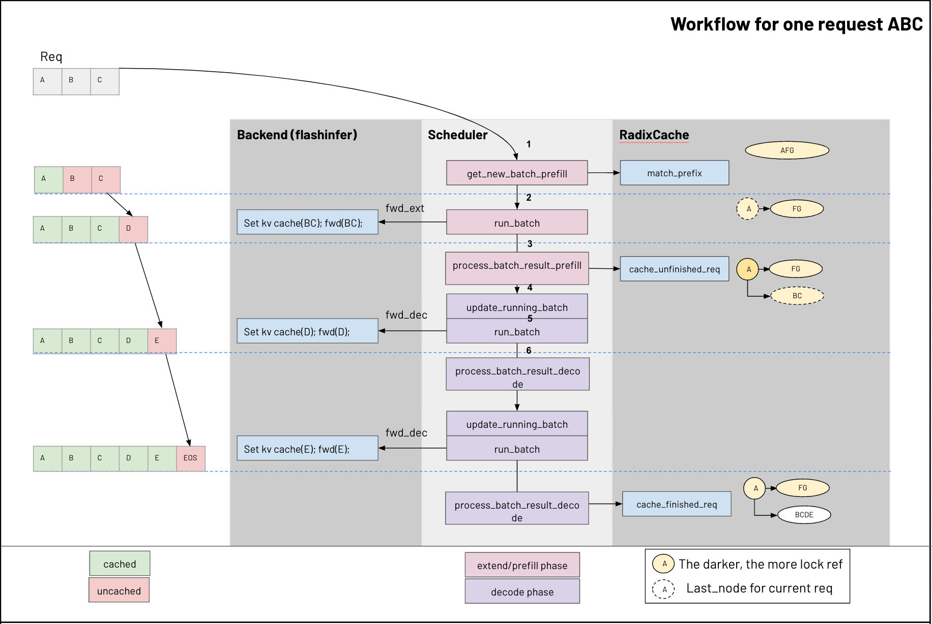 tree_cache 通过 cache_finished_req() 或者 cache_unfinished_req()(chunked prefill 使用) 来重新插入prefix + new allocate 的 cache_loc,然后释放冗余的 kv cache。