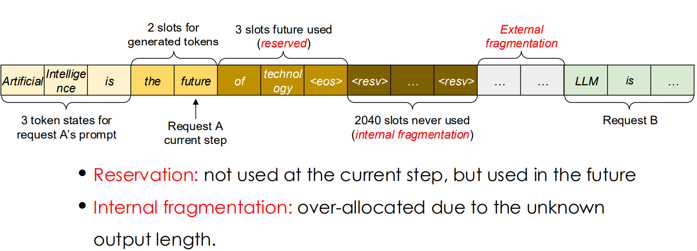 - 内存碎片: 传统的内存分配器(如 PyTorch 中的)要求为 KV Cache 分配连续的(contiguous) VRAM 块(外部碎片),并且会分配比 req 更长的内存作为预留空间(内部碎片)