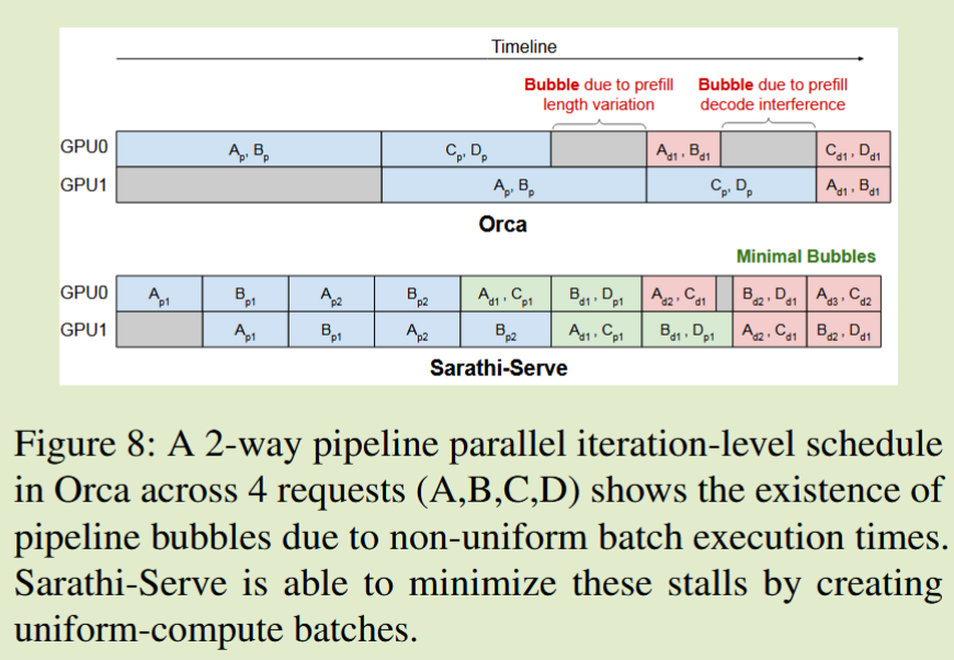- vLLM 会尽可能多地调度新的 prefill,然后才恢复正在进行的 decode,从而引发 generation stall。(牺牲 token 间延迟(TBT)来换取更高吞吐率)