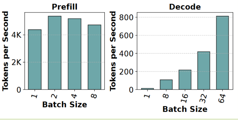 而 Decode 阶段,一个 request 一次只会根据上一个 token 生成下一个 token,相当于做一个 batch size = 1 的矩阵乘法([1 x hidden_dim] @ [hidden_dim x hidden_dim])。这是一个极小的矩阵乘法——GPU 无法被有效利用
