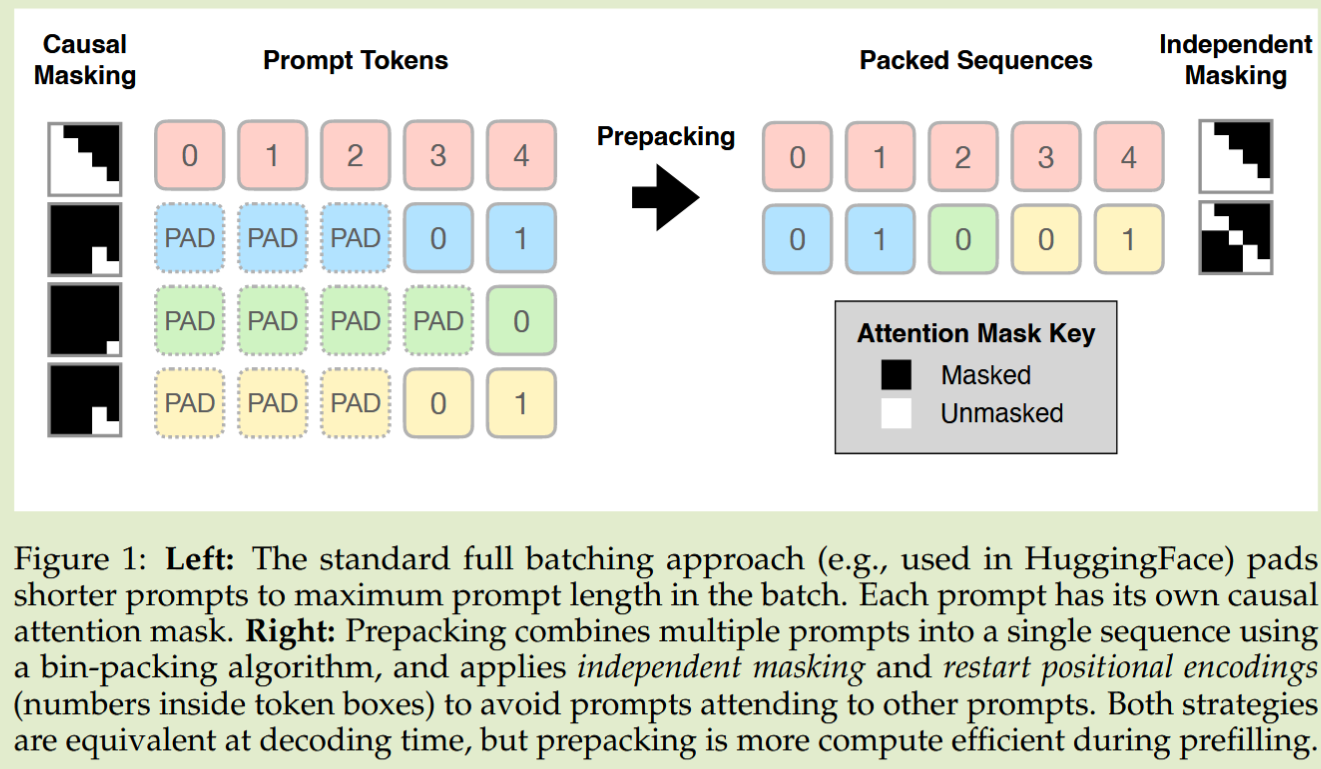 Prepacking 技术通过打包多个 prompt、修改 attention mask 和 positional encoding,实现变长 prefill 的一次性 KV-Cache 生成。