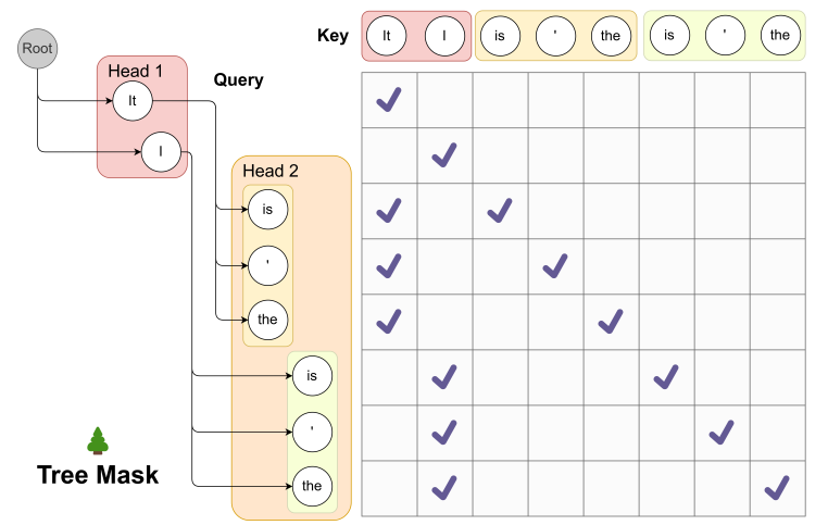 - 为了加速与计算代价之间取得平衡,引入了一种 树状结构的注意力机制(tree-structured attention),可以并行处理多个候选序列,一次验证一整棵树
