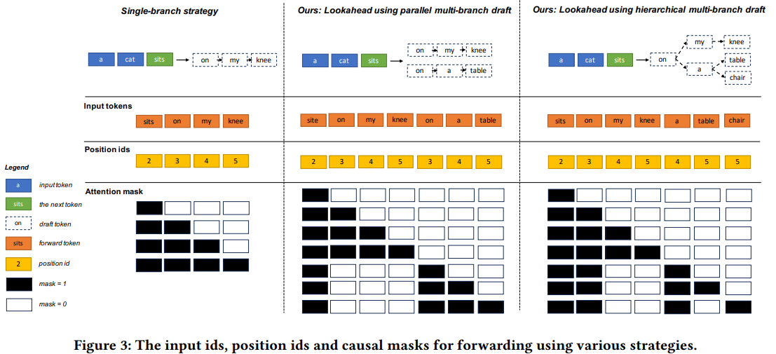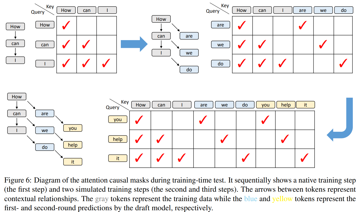 - Tree Mask:每个 token 只能看到来自同一条候选序列(continuation)的历史 token,不能访问其他候选的 token。