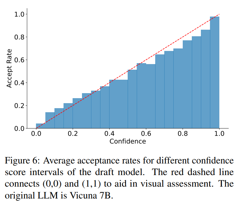 在整个投机采样的流程中,假设轻量 LLM 生成 Draft Tokens 的开销为 \(p\) ,原始 LLM 验证 & Next Token 生成的开销近似为 1 ,那么投机采样在接受 Tokens 数大于 \(1 + p\) 的情况下才有性能收益,并且随着接受的 Tokens 数增加而性能收益越大。