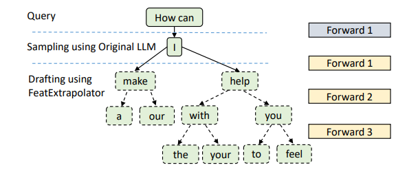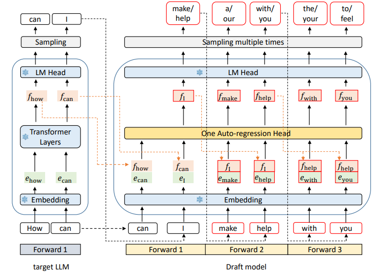 - Train a lightweight plugin, called AutoRegression Head, in conjunction with the Original LLM's frozen embedding layer, to predict the next feature based on the current feature sequence form the second-top-layer of the Original model
